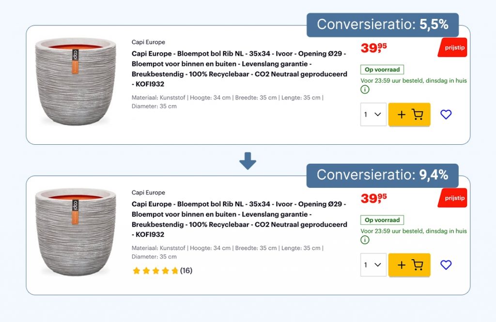 Reviews zijn van onschatbare waarde voor verkopers op platforms zoals Bol.com. Recensies fungeren als een vorm van sociaal bewijs, dat potentiële klanten helpt vertrouwen op te bouwen in producten en merken. Talloze studies tonen aan dat een groot deel van klanten recensies raadpleegt voordat ze een aankoop doen, en producten met een hoger aantal positieve beoordelingen hebben over het algemeen hogere conversieratio’s. Zeker op Bol is het hebben van voldoende reviews belangrijk, omdat Bol een voorkeur geeft in de zoekresultaten aan producten met een hoge reviewscore. Daarnaast kunnen klanten eenvoudig producten vergelijken en klikken ze sneller op een product met reviews dan op een product zonder reviews.