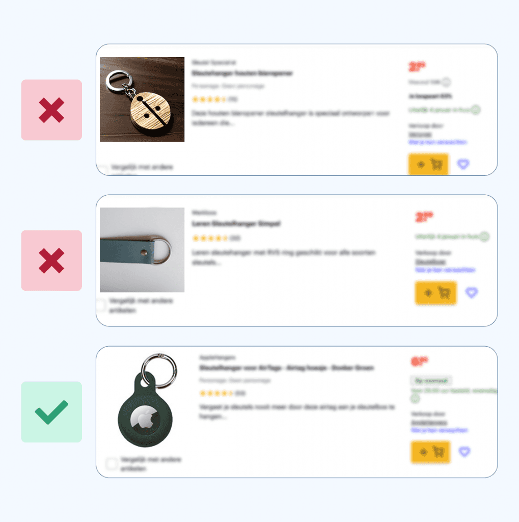 Veel klanten scrollen enkel door je productafbeeldingen en lezen de beschrijving niet of slechts gehaast. Voor een goede conversie is het daarom belangrijk om je foto’s tip-top in orde te hebben. Soms zegt een geweldige Bol productfoto écht meer dan duizend woorden. Onderstaande voorbeelden presteren goed in vrijwel alle productcategorieën:
