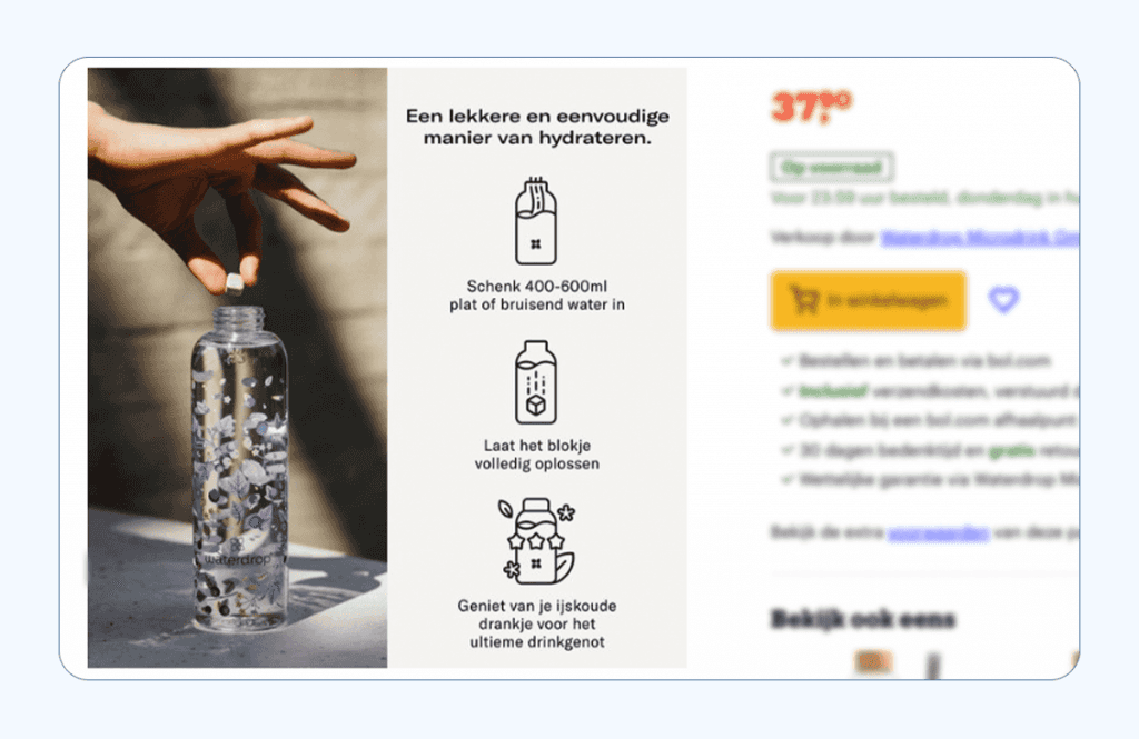 Een productafbeelding met extra iconen en korte info zorgt ervoor dat je extra voordelen of uitleg kunt toevoegen die je normaal alleen in je productbeschrijving hebt staan. Gebruik je merkkleur en eigen lettertype zodat de foto aansluit op je branding en zorg dat je niet té veel tekst gebruikt: het moet immers wel een foto blijven.